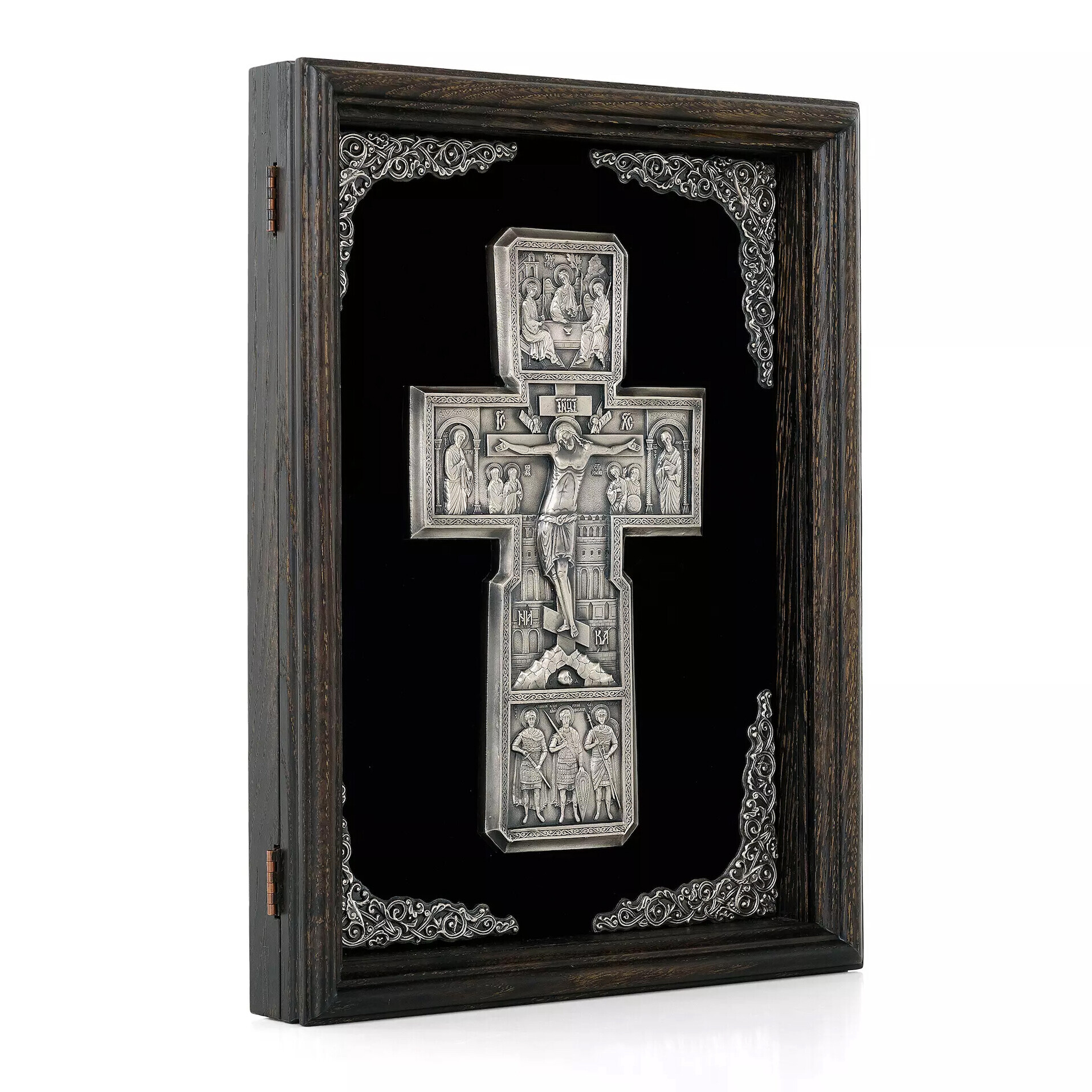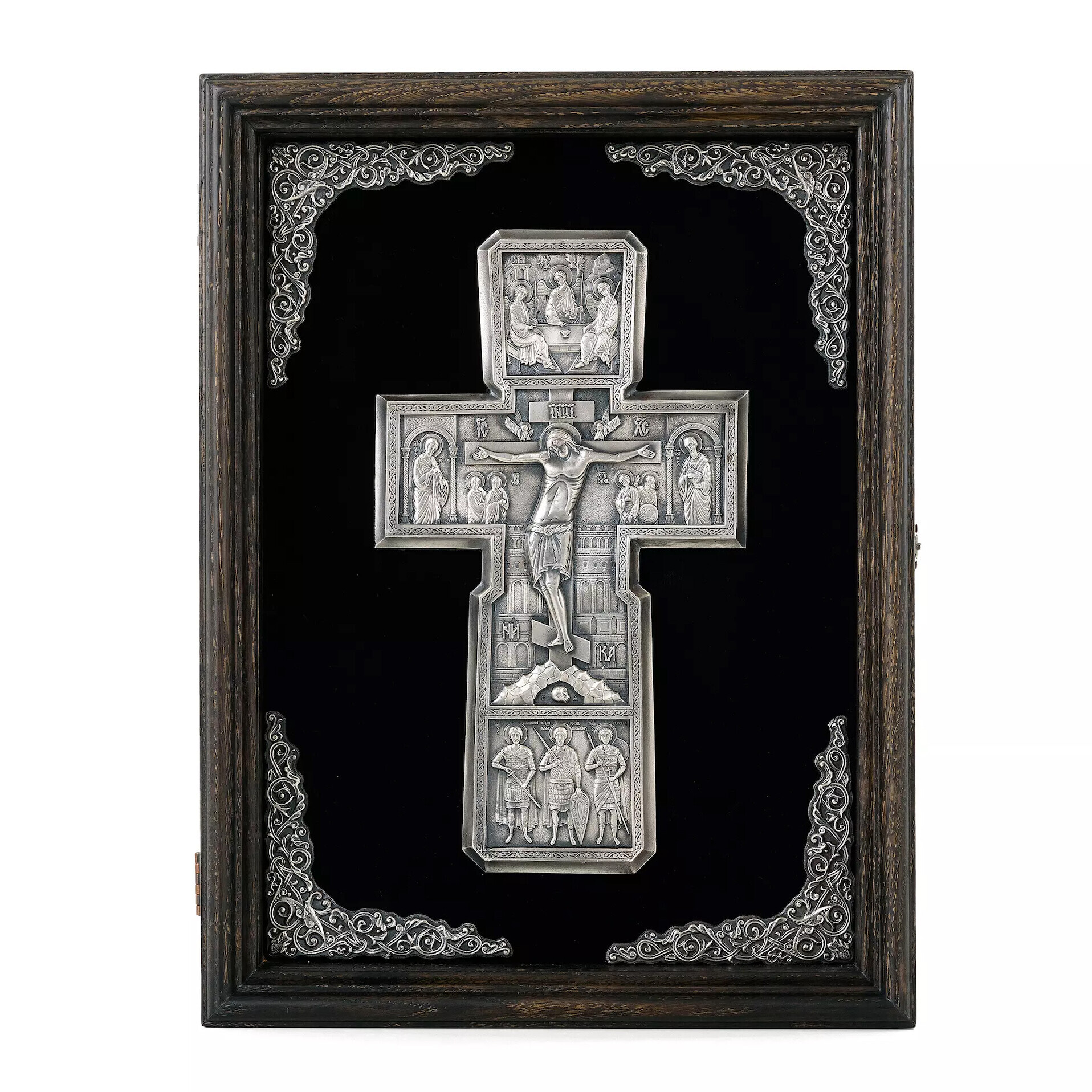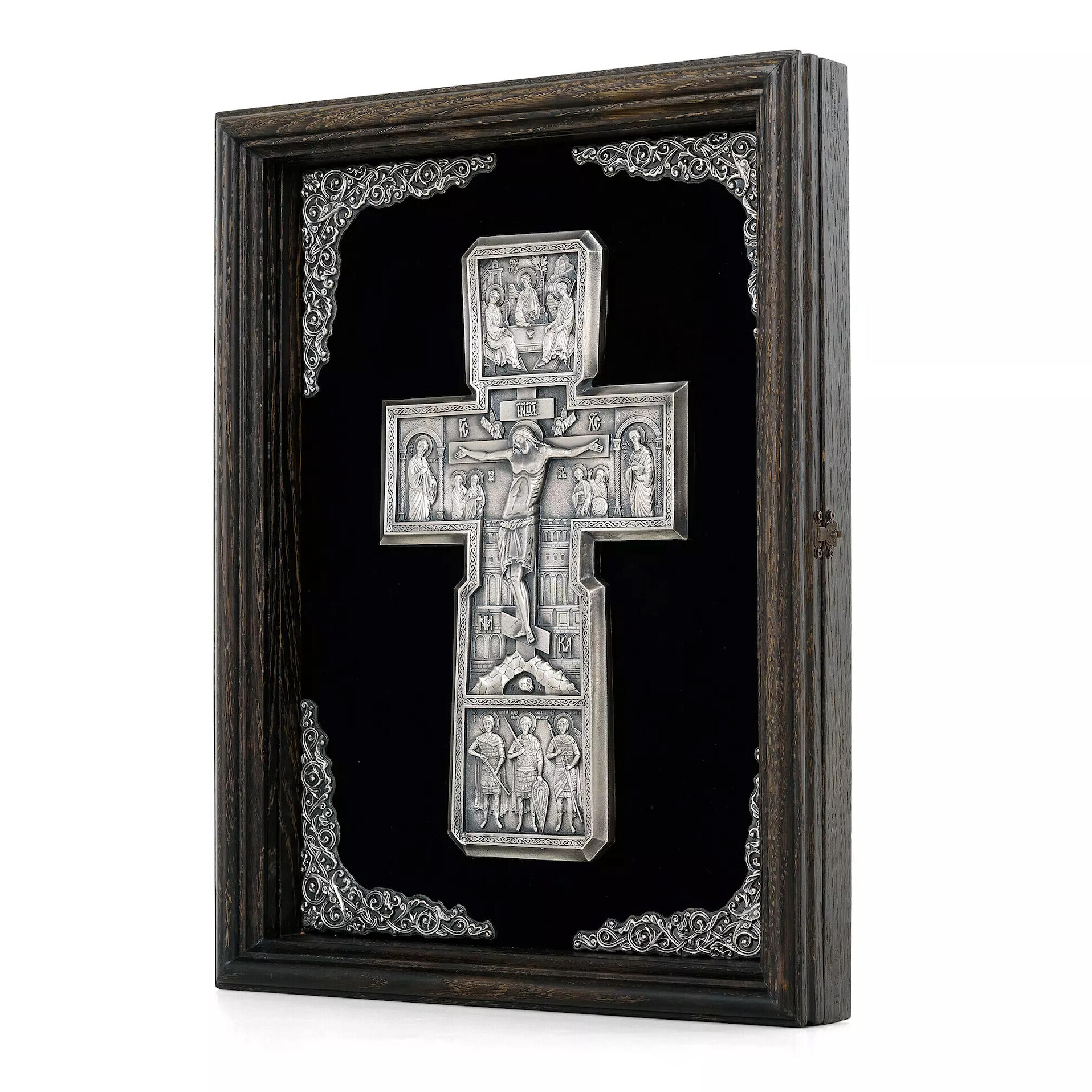 Aceasta cruce ortodoxa reprezinta o piesa deosebita de arta sacra, realizata prin tehnica precisa a electroformarii, ce confera detaliilor o finete aparte. Lucrarea are dimensiunile de 32 cm x 45 cm si este confectionata din cupru placat cu argint, transformand-o intr-un veritabil crucifix de argint, cu o estetica nobila si durabilitate crescuta.