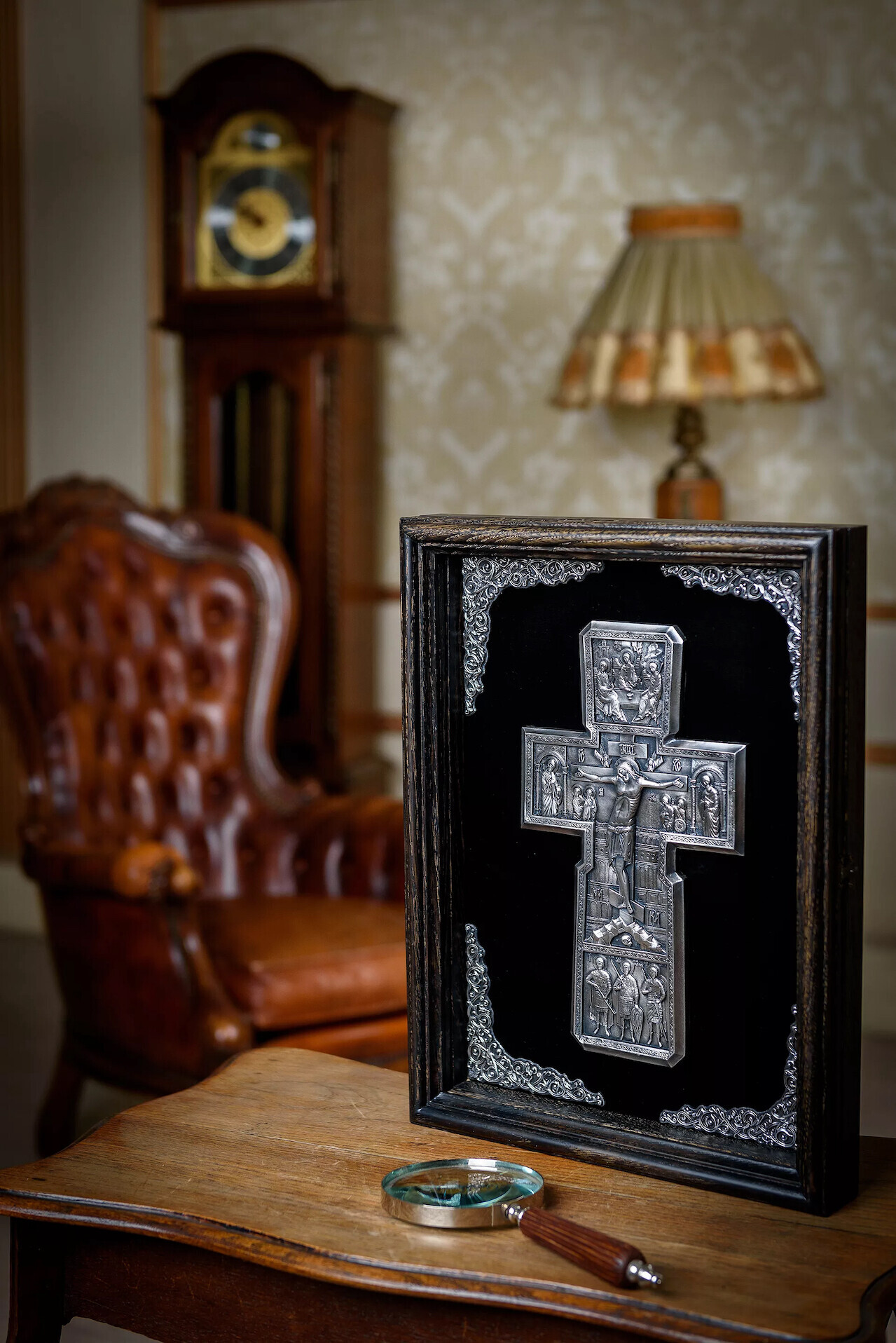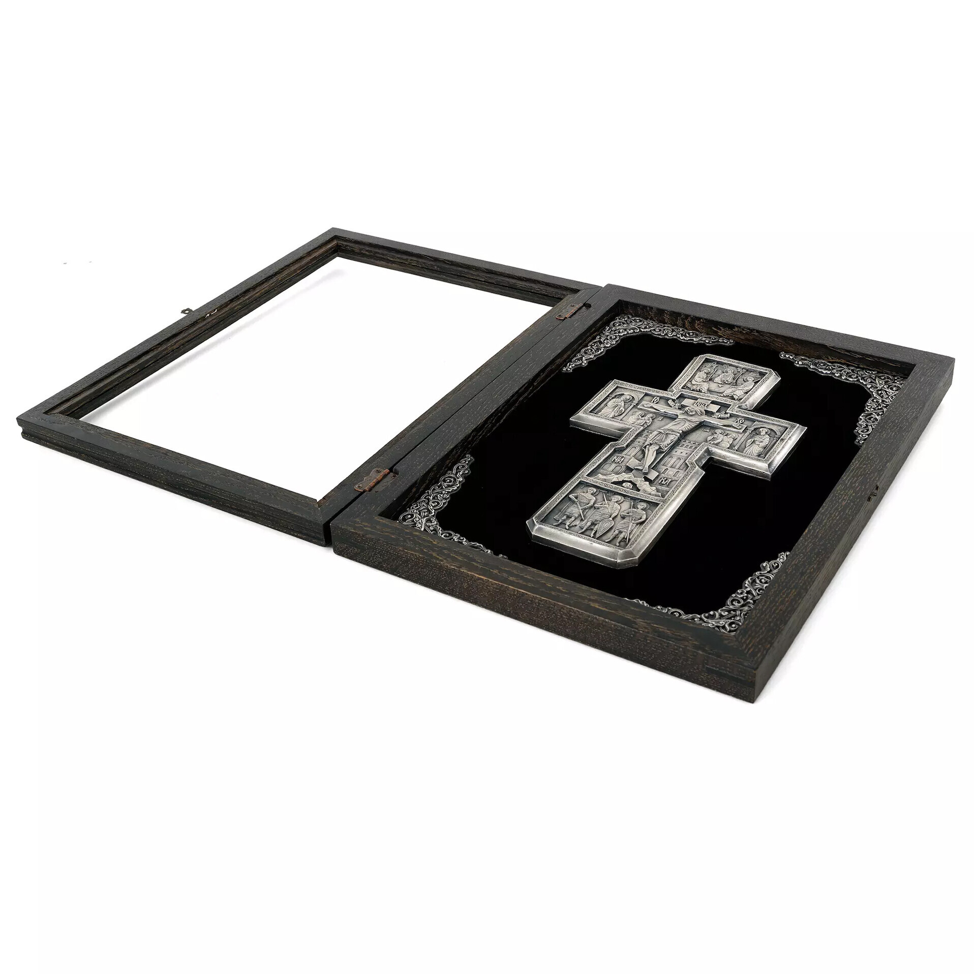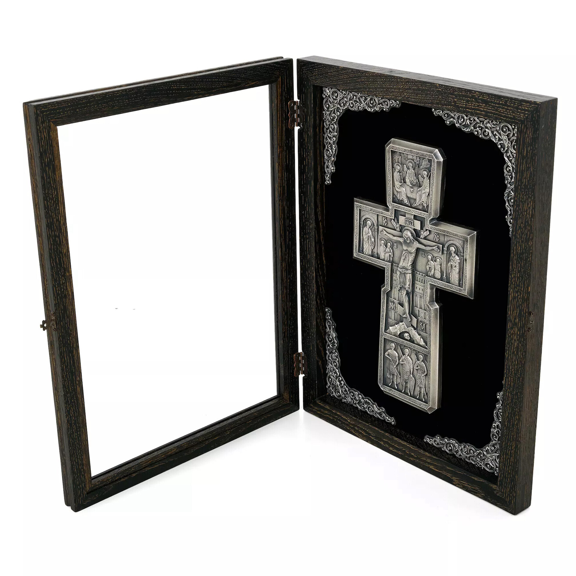 Crucea este incadrata intr-o rama eleganta, lucrata din lemn natural de stejar tonifiat, oferind un contrast cald si sobru in acelasi timp. Pentru protectie si un plus de rafinament, intreaga lucrare este asezata sub geam de sticla, pastrandu-si astfel frumusetea in timp.
