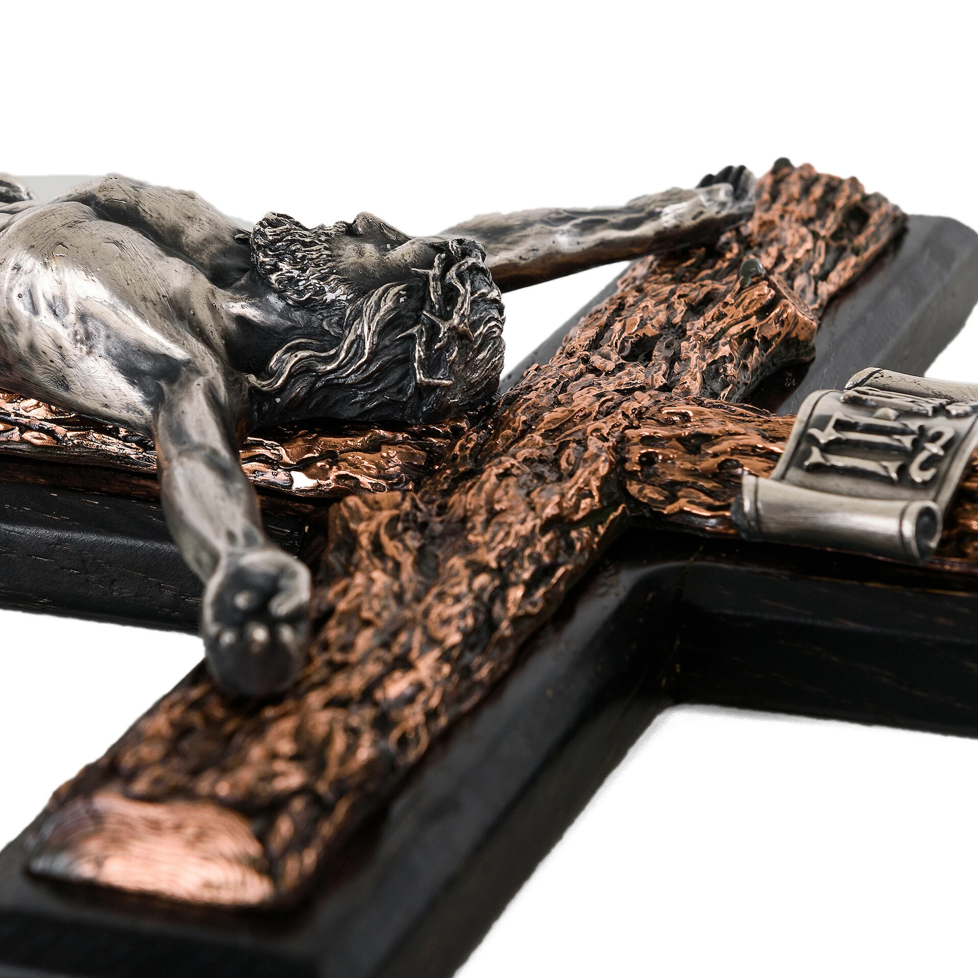 Aceasta cruce ortodoxa nu este doar un obiect de cult, ci o marturie sculptata a durerii si iubirii divine. Realizata cu rafinament prin tehnica electroformarii, imaginea rastignirii este surprinsa cu un realism impresionant: Hristos, turnat in cupru placat cu argint, pare sa respire printre fibrele metalice, in timp ce lemnul de stejar tonifiat evoca trunchiul viu si aspru al crucii de pe Golgota.
