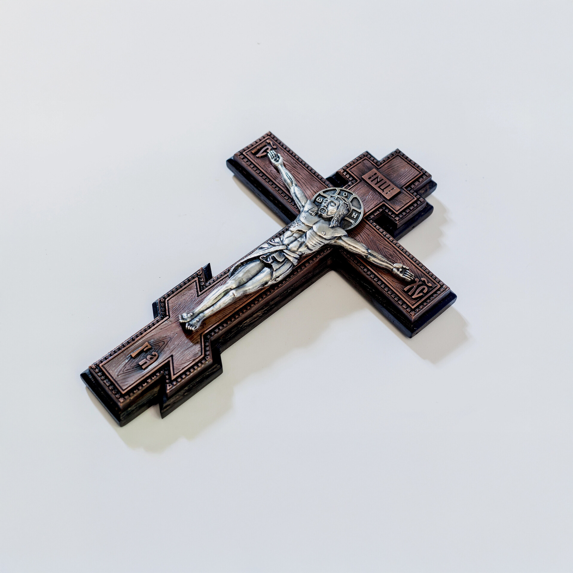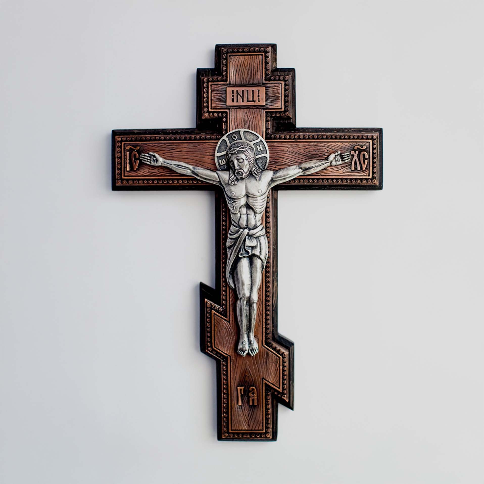 Crucifix ortodox de perete elegant, realizat prin tehnica de electroformare, ce imbina mestesugul traditional cu materiale de calitate superioara.