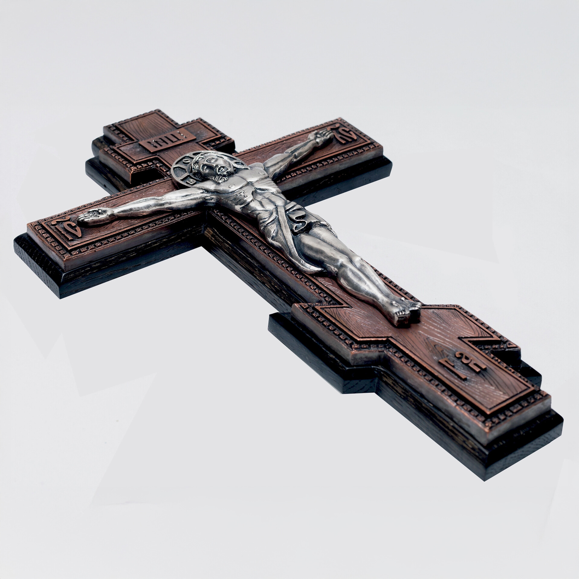 Crucifix ortodox de perete elegant, realizat prin tehnica de electroformare, ce imbina mestesugul traditional cu materiale de calitate superioara. Chipul Mantuitorului este modelat din cupru placat cu argint, oferind un aspect nobil si durabil. Crucea este lucrata din lemn natural de stejar tonifiat, cu o textura rustica si un finisaj impecabil.