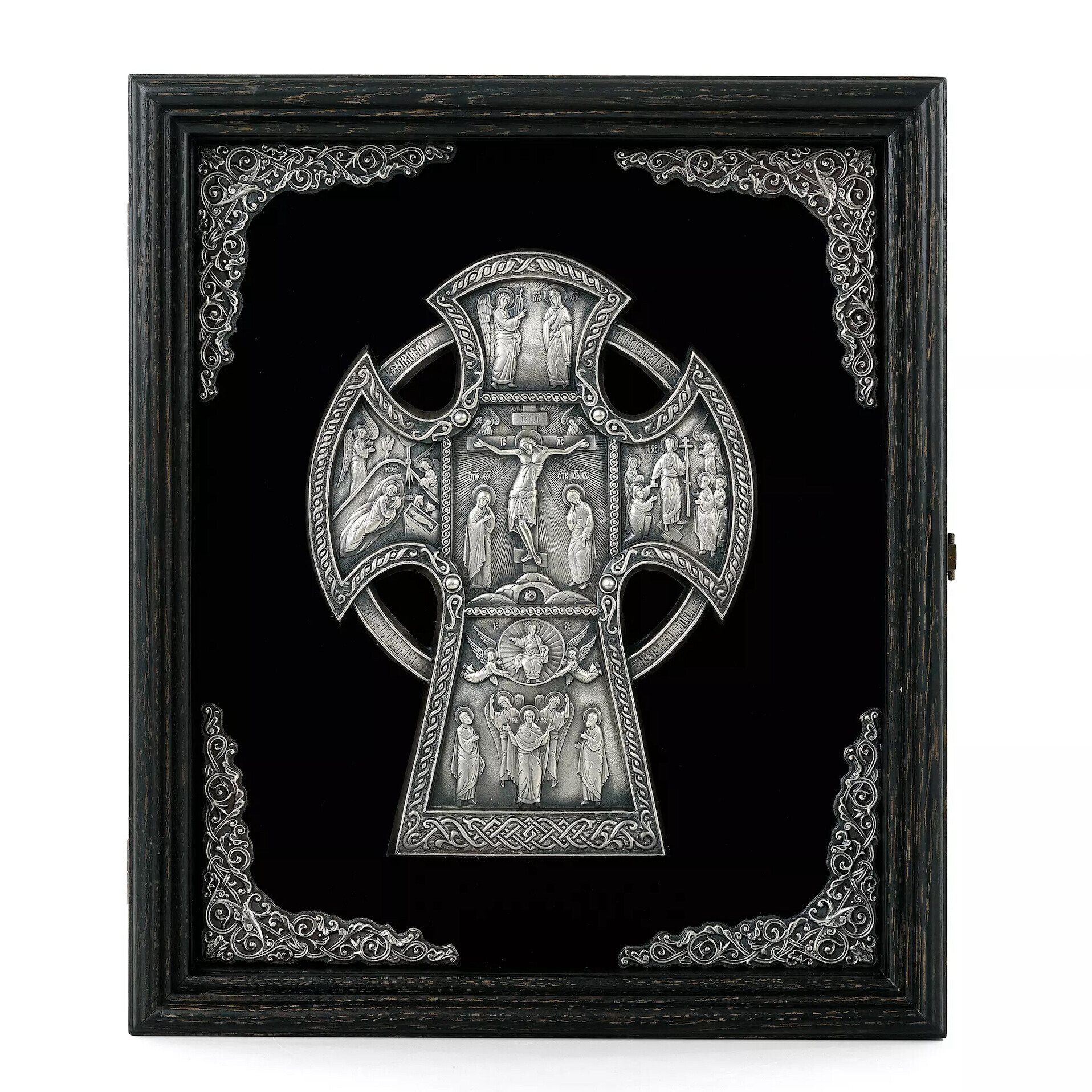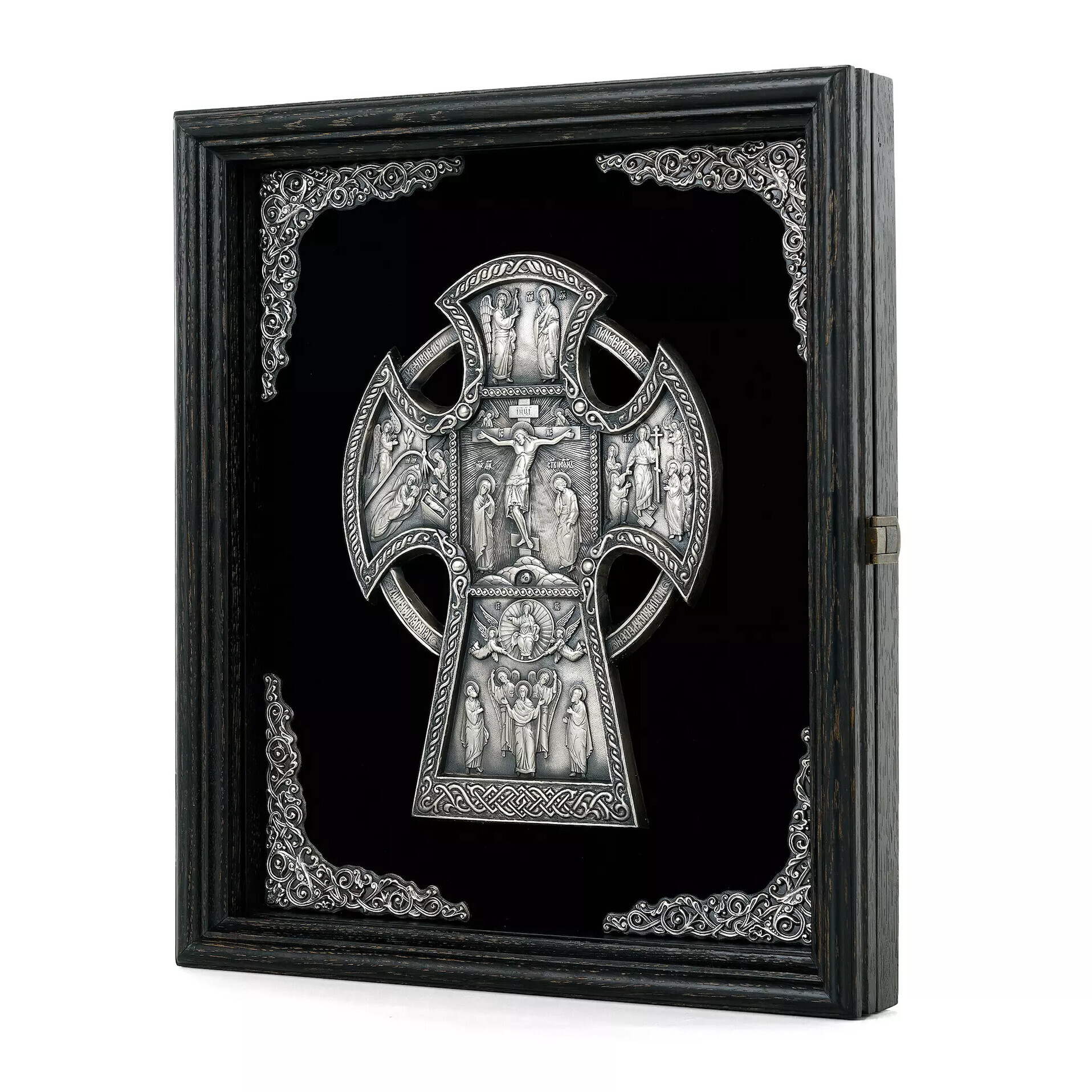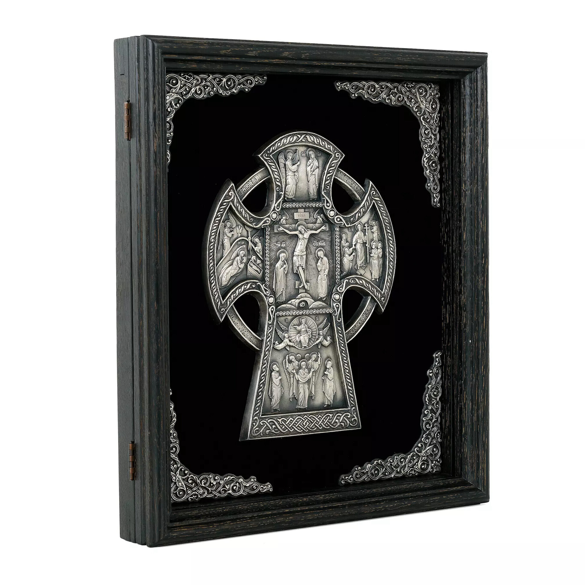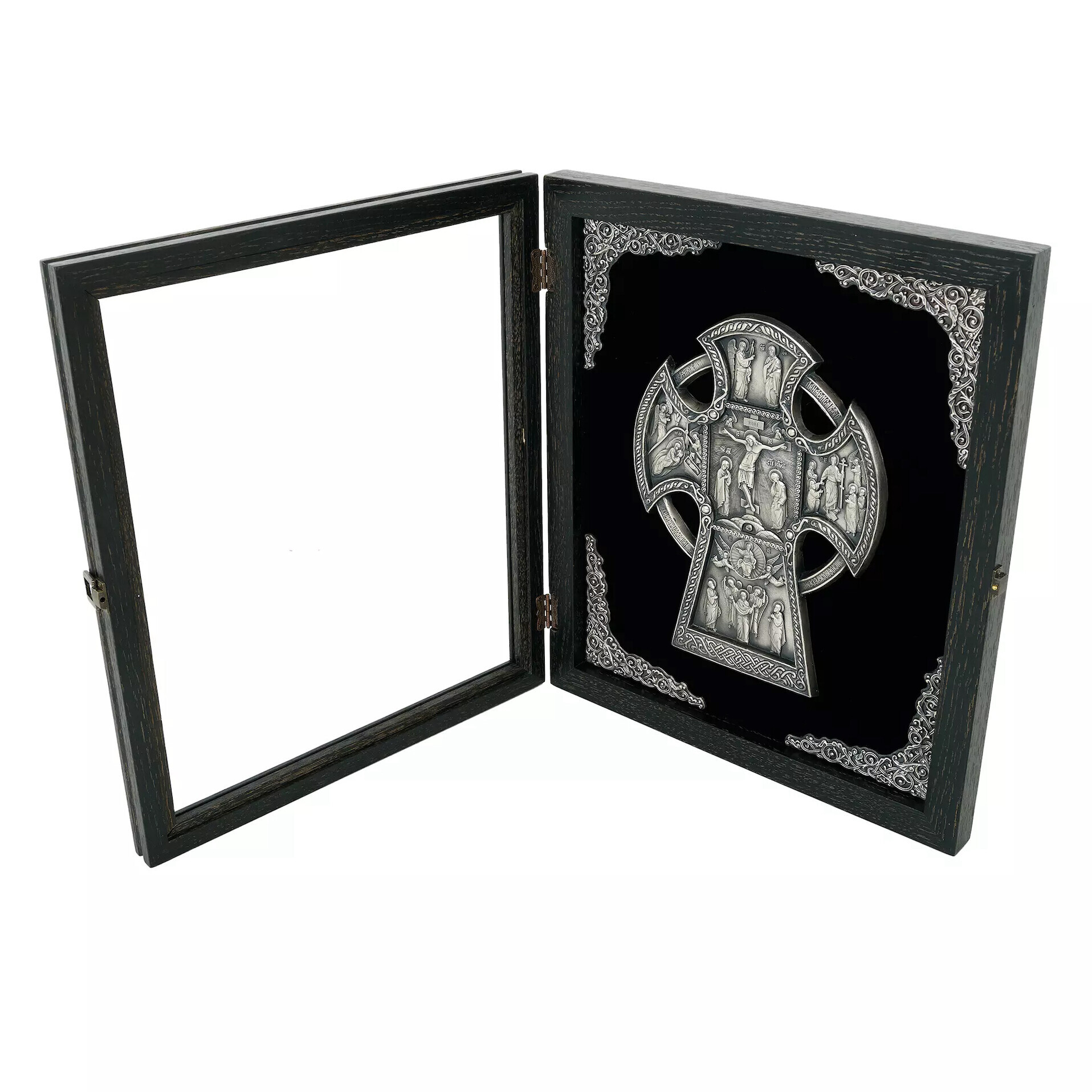 Incarcata intr-o rama din lemn natural de stejar tonifiat, crucea capata o prezenta calda si impunatoare, ideala pentru spatii de rugaciune, icoane de perete sau altare personale. Pentru protectie si conservare, intreaga lucrare este asezata sub geam de sticla, pastrand astfel frumusetea si integritatea in timp.